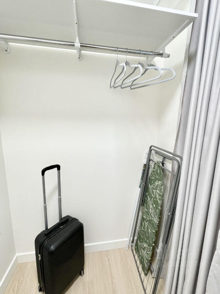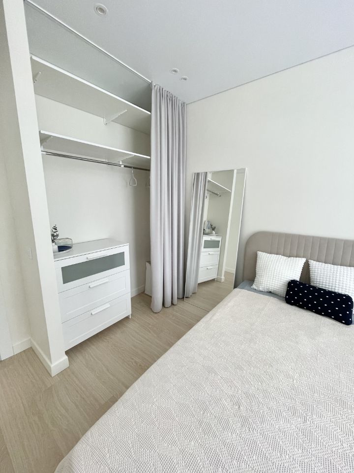 Полноценная огромная гардеробная в спальне с зеркалом) При желании зеркало может перемещаться по квартире . Вы сможете создать интерьер под себя Гардеробная со стиральной машиной и местами хранения для хозяйственных нужд при входе. Гладильная доска и сушилка .