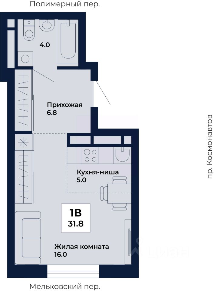 Продаётся студия в строящемся доме (Дом 8,9), срок сдачи: I-кв. 2029, общей площадью 31.8 кв.м., на 16 этаже. ЖК ''Космос'' - современный жилой квартал на проспекте Космонавтов 7, который строит ГК ''Ривьера Инвест Екатеринбург''. Жилой комплекс - это пять домов, благоустроенная территория комплекса и наземная парковка. Места общего пользования также выполнены в единой стилистике ''космической'' темы, используемой и в оформлении холлов, и дворов.
