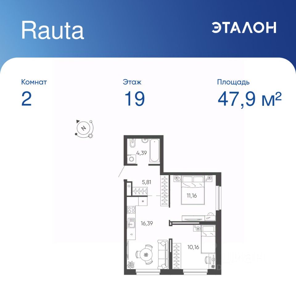 Общая площадь квартиры — 47.91 кв. м, этаж 19 из 24.