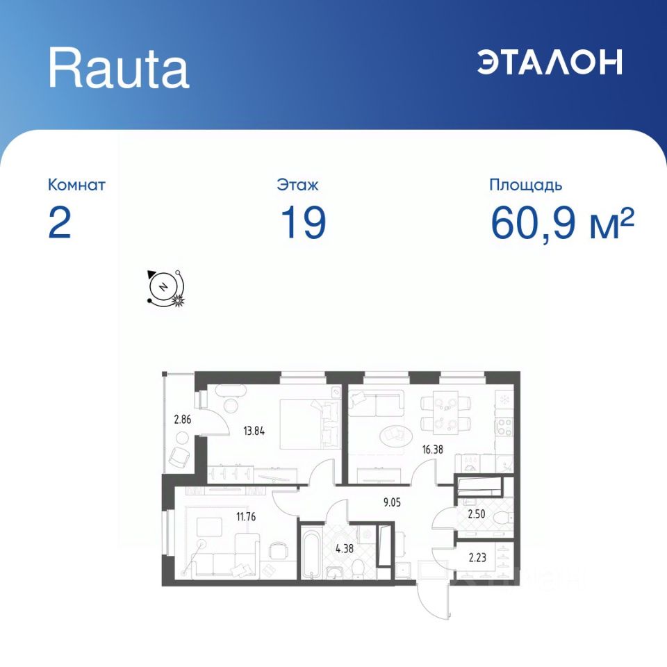 Общая площадь квартиры — 60.9 кв. м, этаж 19 из 25.