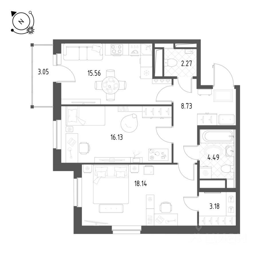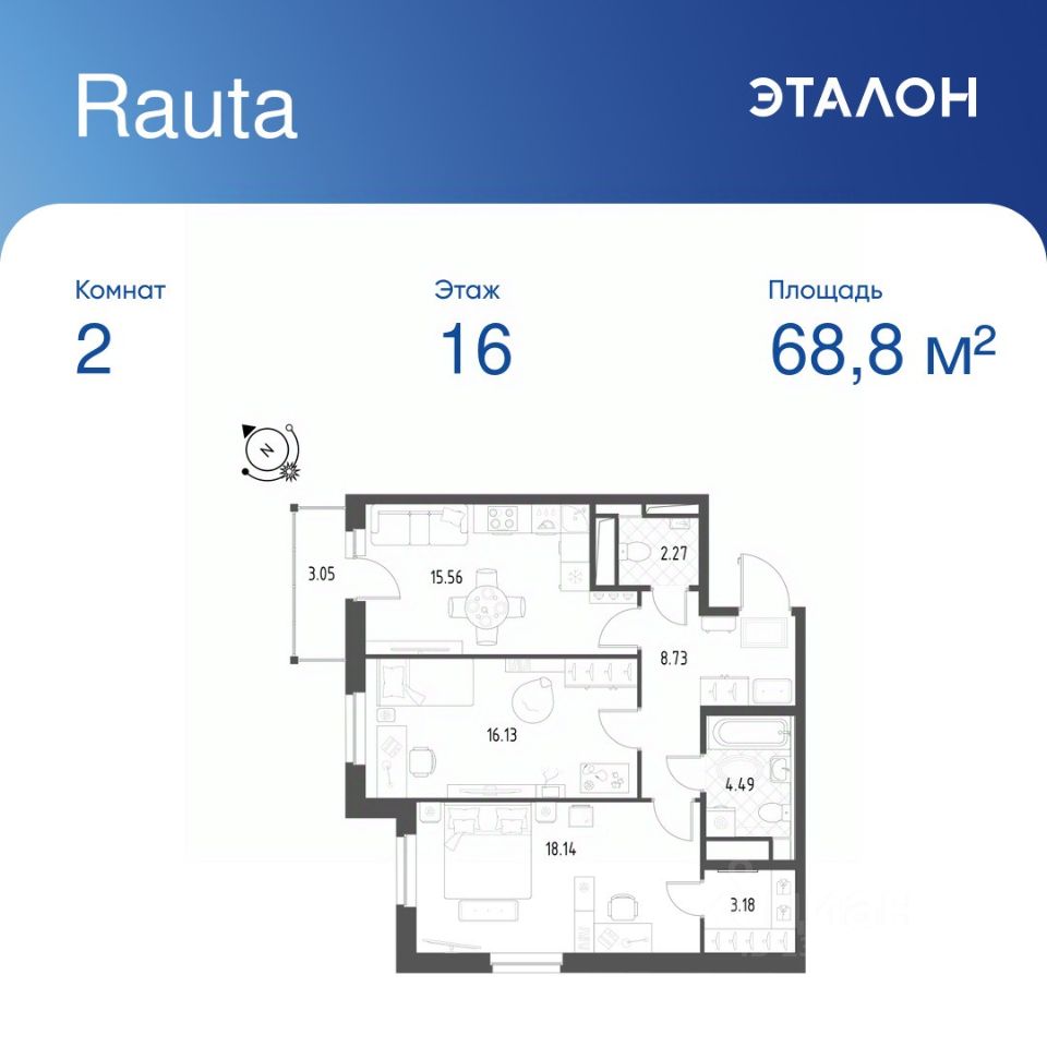 Общая площадь квартиры — 68.8 кв. м, этаж 16 из 25.