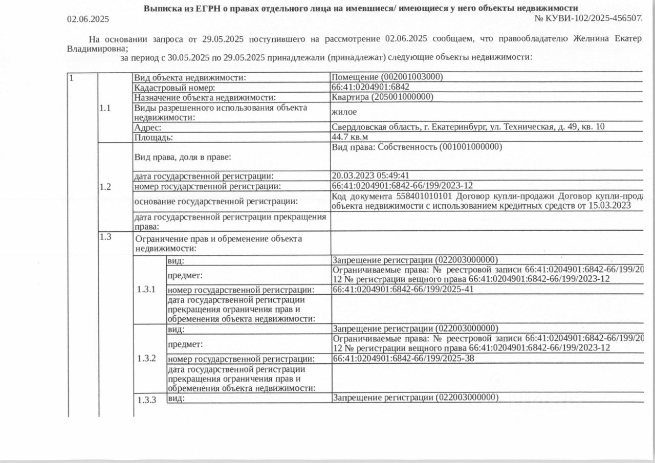 Должник: Желнина Е.В., собственник: Желнина Е.В. Лот: Жилое помещение (квартира), площадь 44,7 кв.м., кадастровый номер: 66:41:0204901:6842, г. Екатеринбург, ул. Техническая, д. 49, кв. 10, (зарегистрированные лица - 1 взрослый, 1 несовершеннолетний), н/ц: 2770686,52 р., з-к: 2770 р., код: 0014, рег. 02-2915/25