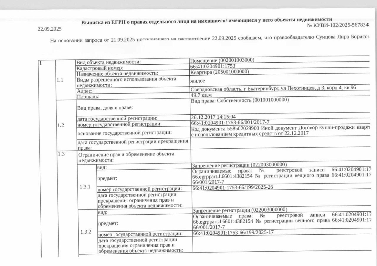 Должник: Сунцова Л.Б., собственник: Сунцова Л.Б. Лот: Жилое помещение (квартира), площадь 49,7 кв.м., кадастровый номер: 66:41:0204901:1753, г. Екатеринбург, ул. Пехотинцев, д. 3, корп. 4, кв. 96, (зарегистрированные лица - 3 взрослых), н/ц: 3195107,84 р., з-к: 3195 р., код: 0014, рег. 02-3024/25