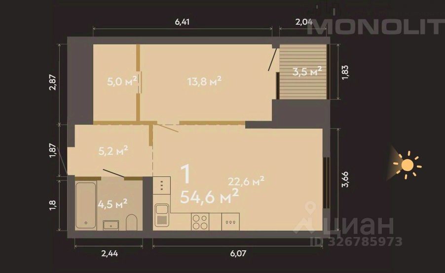 Общая площадь: 54,3 кв.м.