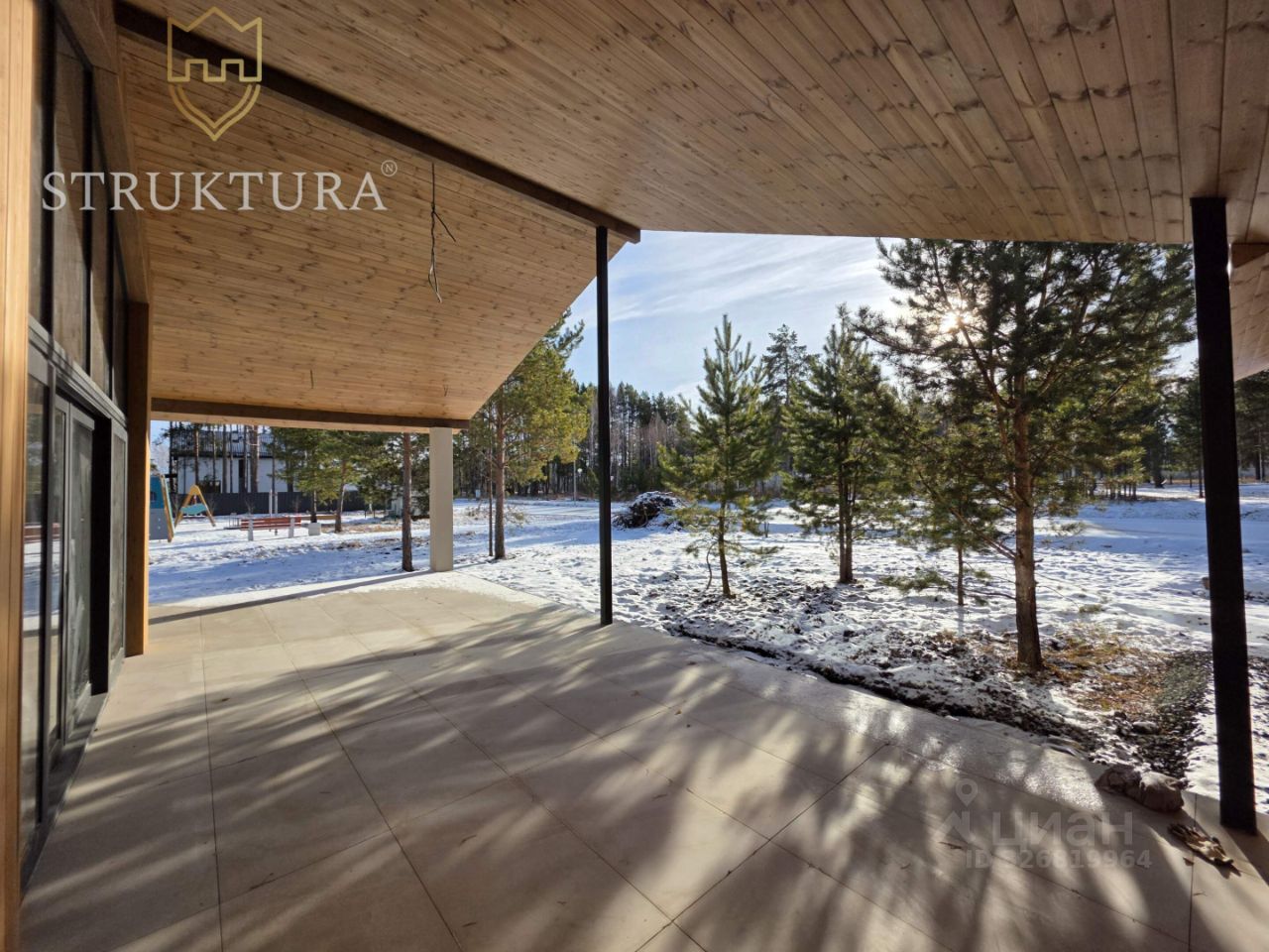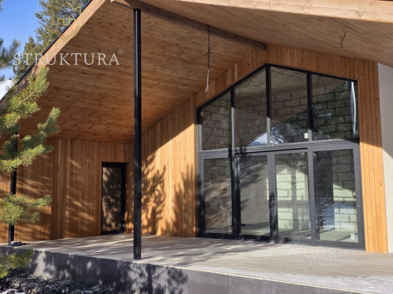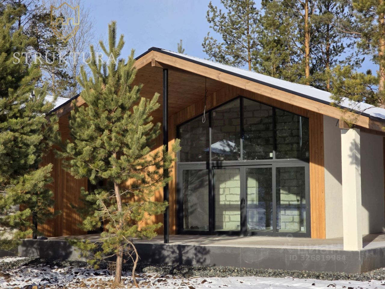 Просторный дом с архитектурным остеклением в окружении соснового леса.