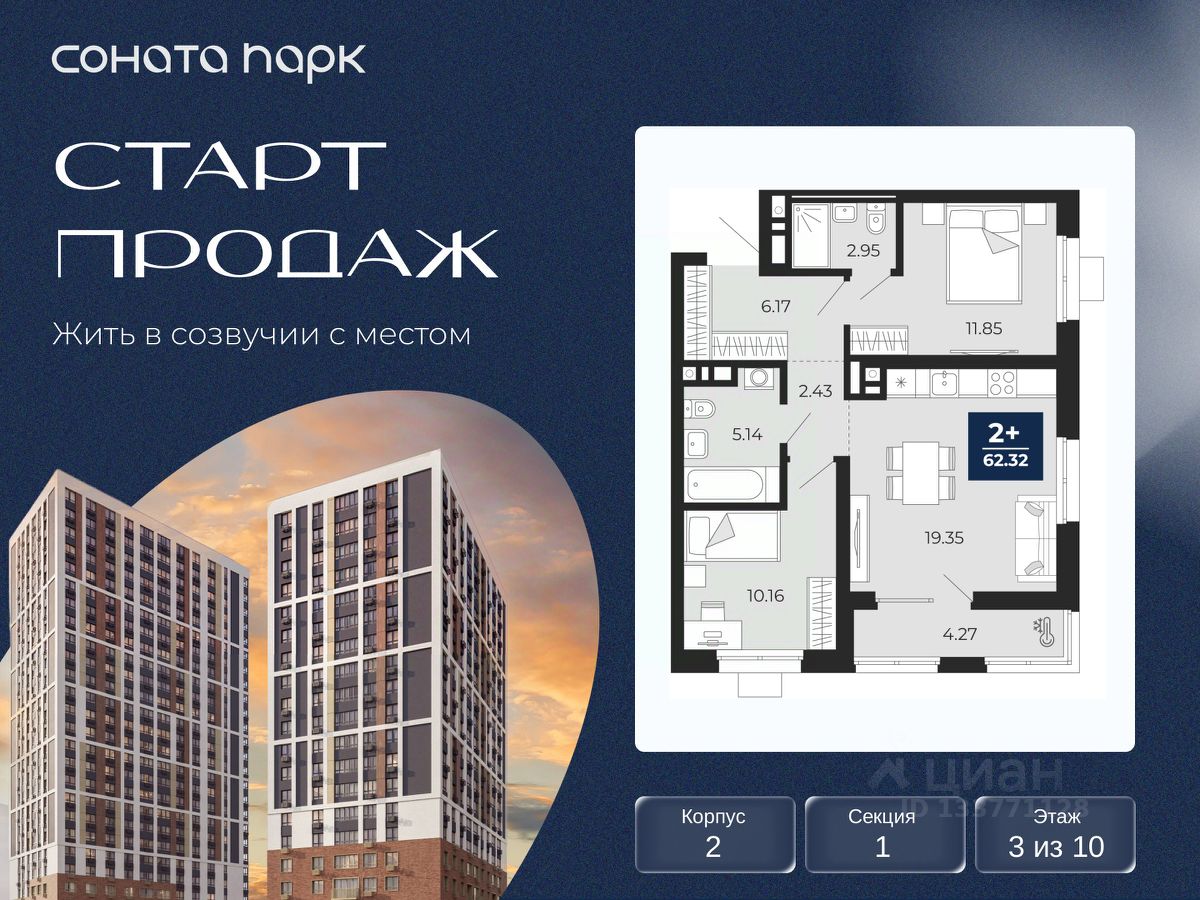 2-комн. квартира от застройщика с предчистовой отделкой в ЖК ''Соната Парк'' на 3 этаже. Общая площадь: 62.32 кв.м. Высота потолков 2.72 м.