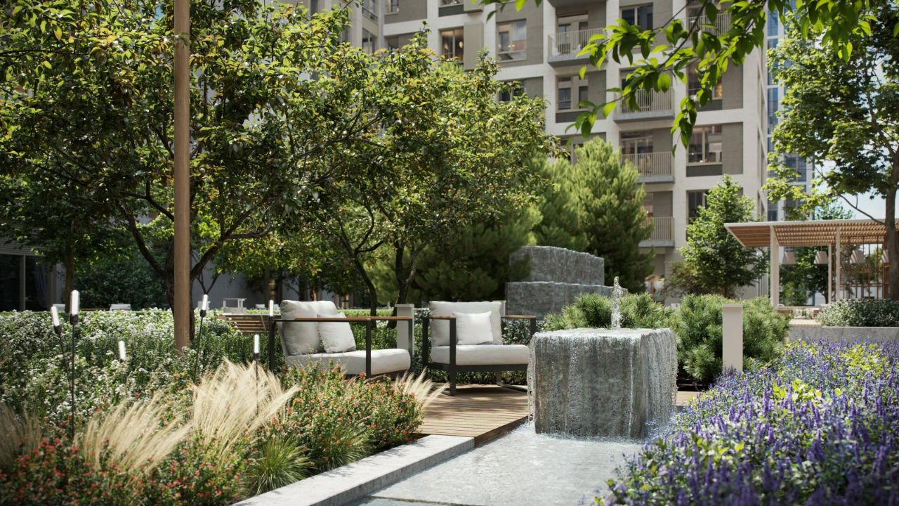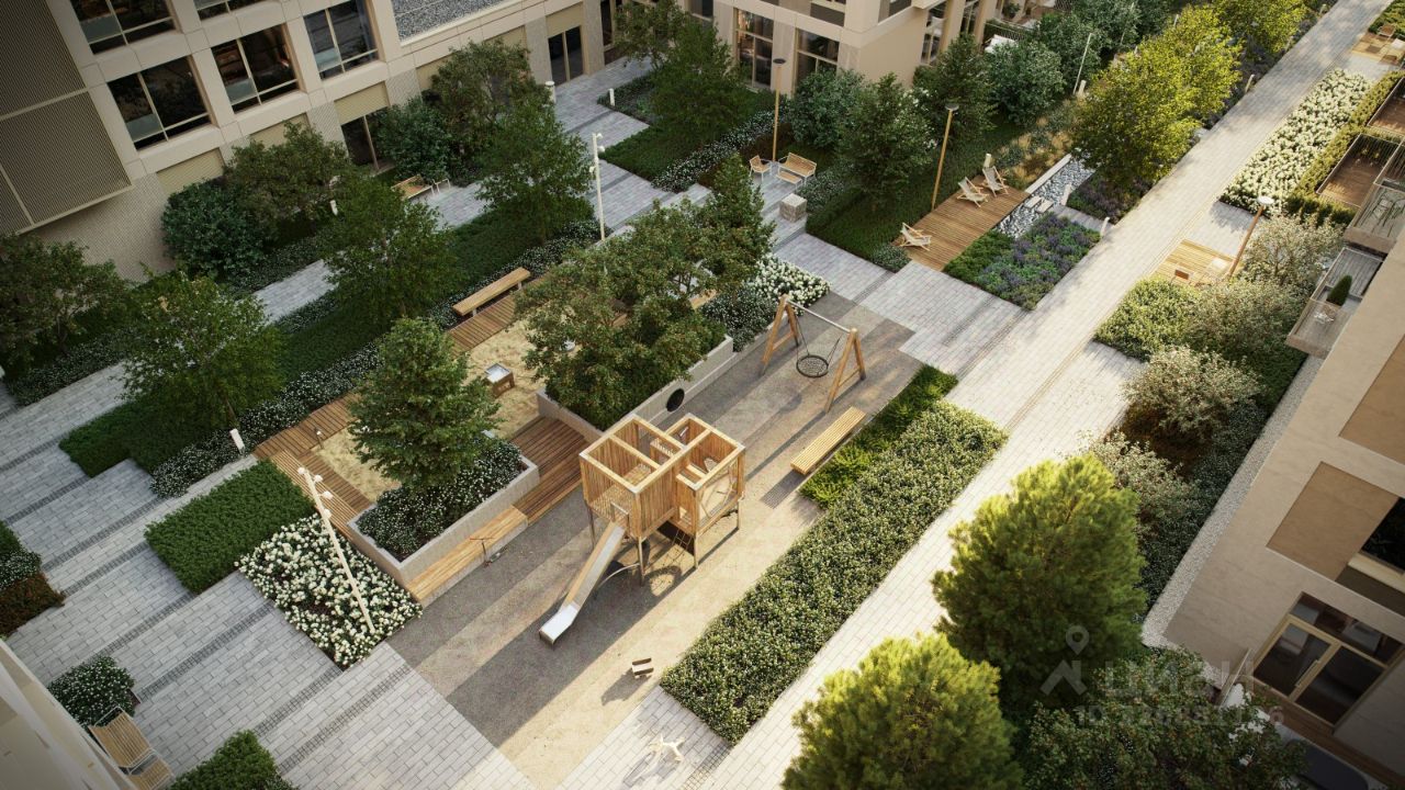 Благоустройство жилого комплекса это синтез искусства и природы. Поющие музыкальные инсталляции и поэтический променад. Оркестр растений: сирень, гортензии и яблони, чья цветущая палитра сменяется в течение года.
