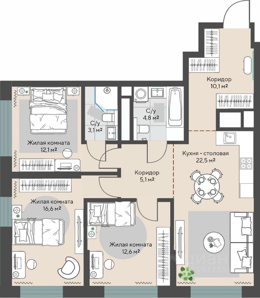 Продаётся 3-комнатная квартира в строящемся доме (Дом 1 этап 1.1), срок сдачи: I-кв. 2028, общей площадью 86.9 кв.м., на 24 этаже.