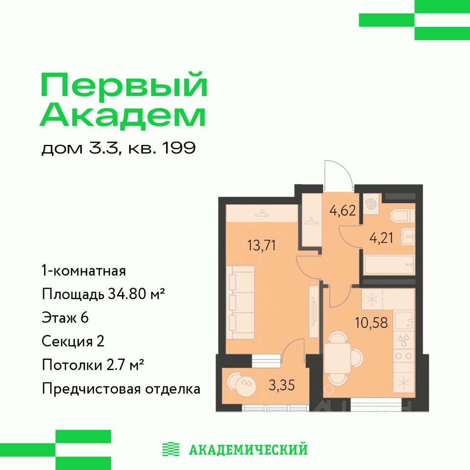 Продается 1-комнатная квартира площадью 34.8 кв.м. от девелопера ''Академический'' в жилом квартале ''Первый Академ''. Срок сдачи дома в 2028 году. Выгоды и скидка напрямую от застройщика.