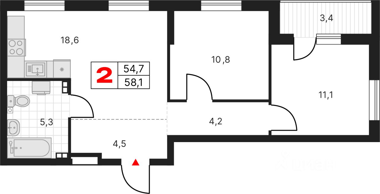 Продаётся квартира в Клубный дом ''Московский Квартал'', 12 дом. 2-комнатная квартира, 58,08 м², 241. Стоимость указана с учетом чистовой отделки.