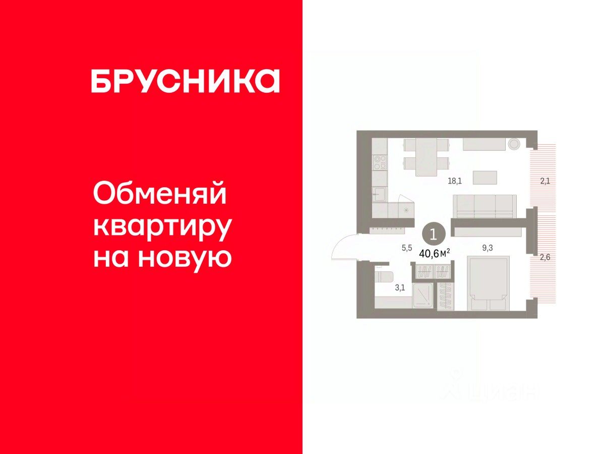 Квартира с кухней-гостиной и одной спальней в Бруснике в Академическом. Особенности планировки: балкон, предчистовая отделка. квартиры в нашей базе: АКД04-Ж2.2.4.