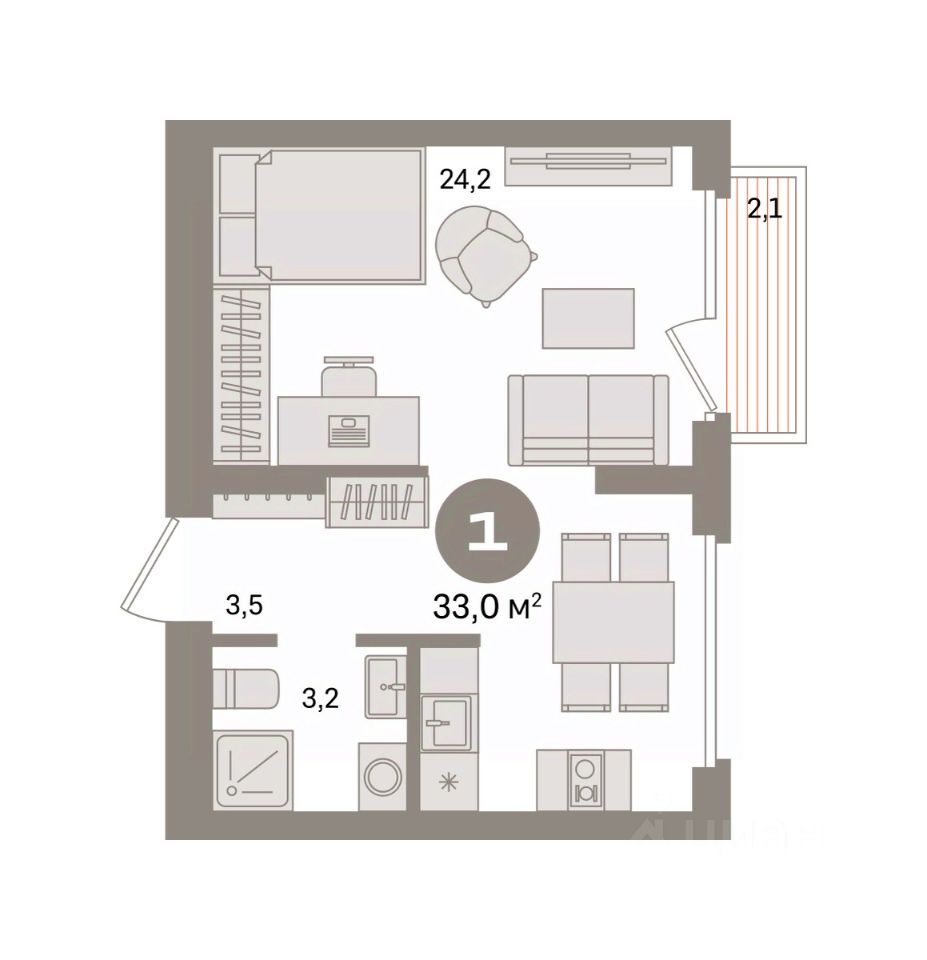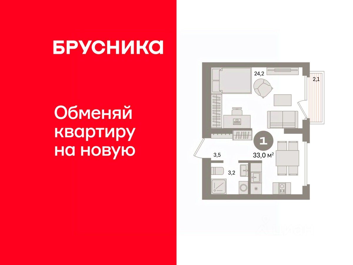 Студия в Бруснике в Академическом. Особенности планировки: балкон, предчистовая отделка. квартиры в нашей базе: АКД04-Ж2.9.2.
