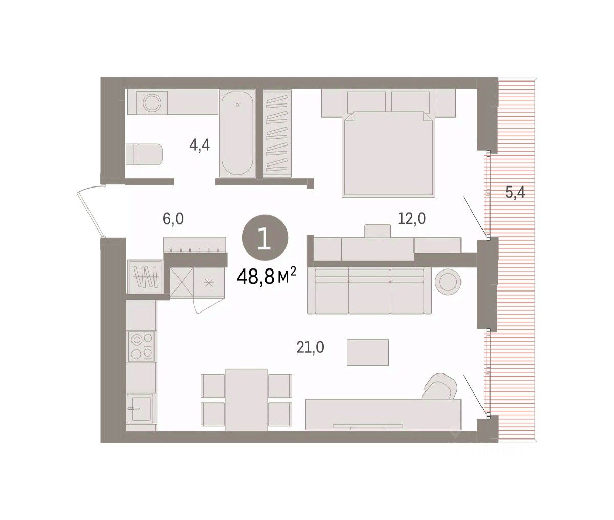 Общая площадь48,8 м2