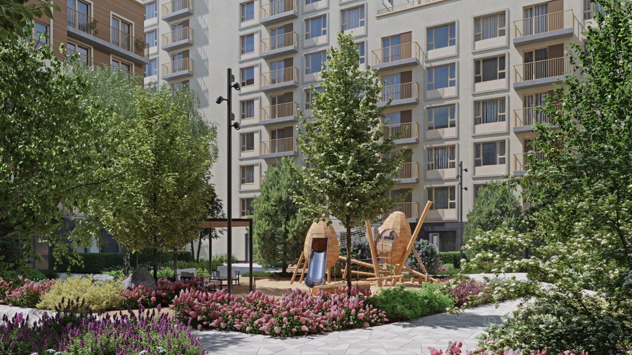 Каждый двор в квартале ''Траектория'' — продолжение квартиры, только под открытым небом. Здесь можно прогуляться босиком по траве, устроить утреннюю йогу, почитать книгу в гамаке или отправить детей поиграть, не переживая за их безопасность.