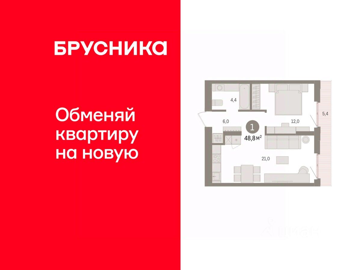 Однокомнатная квартира с предчистовой отделкой в ЖК ''Квартал Траектория'' на 7 этаже. Общая площадь: 48.8 кв.м., жилая: 12 кв.м., площадь просторной кухни-столовой: 21 кв.м. Все окна выходят на одну сторону. В квартире один балкон, один совмещенный санузел. Высота потолков 2.82 м.