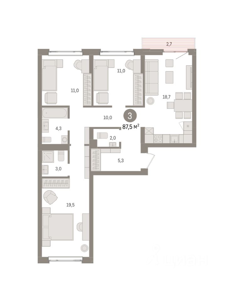 Квартира с кухней-гостиной и тремя спальнями в квартале ''Траектория''. Особенности планировки: балкон, вид во двор, второй санузел, гардеробная, мастер-спальня, окна на две стороны, предчистовая отделка, разнесённые спальни. квартиры в нашей базе: МНВ01-Ж8.5.2.