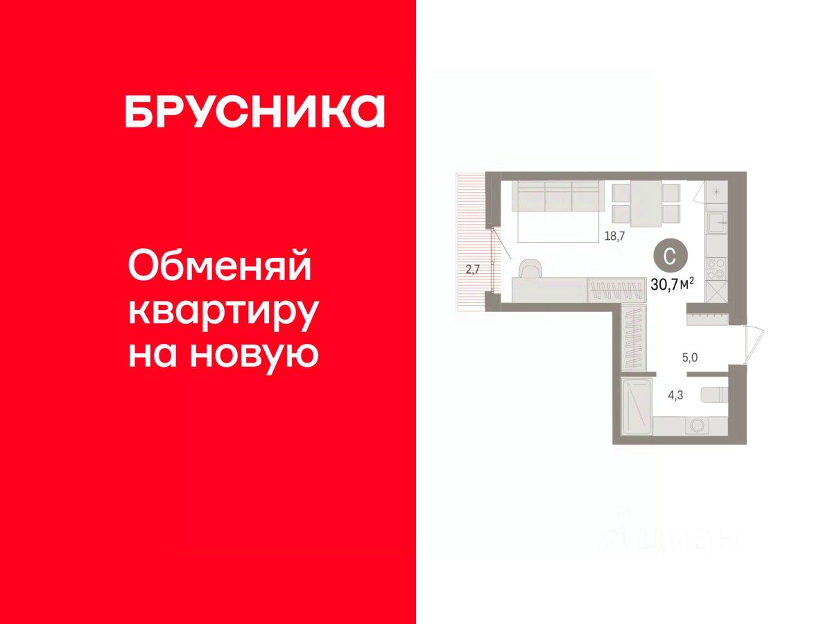 Однокомнатная студия с предчистовой отделкой в ЖК ''Квартал Траектория'' на 7 этаже. Общая площадь: 30.7 кв.м., площадь гостиной 18.7 кв.м., из которых 5 кв.м. выделено под кухонную зону. Все окна выходят на одну сторону. В квартире один балкон, один совмещенный санузел. Высота потолков 2.82 м.