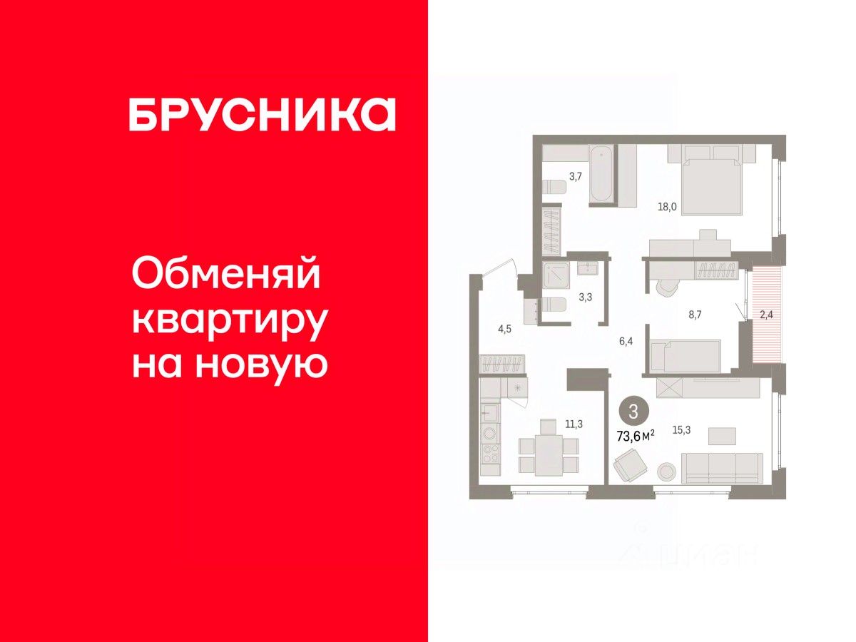 Квартира с кухней-гостиной и тремя спальнями в квартале ''Траектория''. Особенности планировки: лоджия, мастер-спальня, предчистовая отделка, разнесённые спальни. квартиры в нашей базе: МНВ01-Ж12.12.5.
