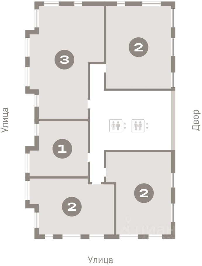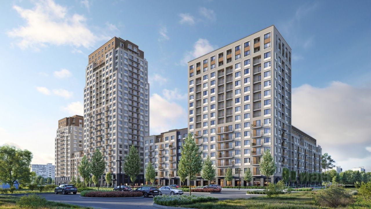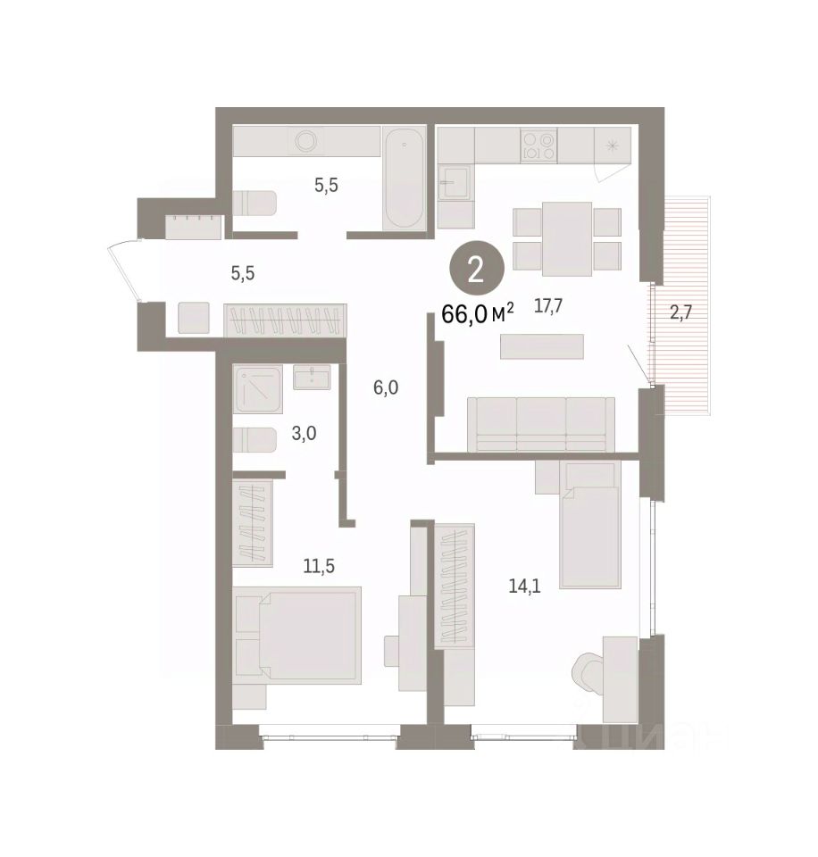 Квартира с кухней-гостиной и двумя спальнями в квартале ''Траектория''. Особенности планировки: балкон, вид во двор, мастер-спальня, предчистовая отделка, разнесённые спальни. квартиры в нашей базе: МНВ01-Ж9.14.1.