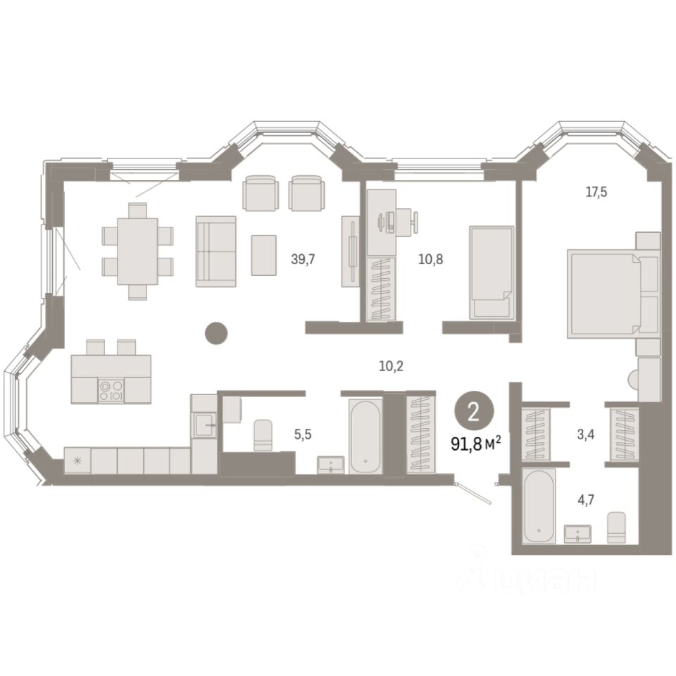 Квартира с кухней-гостиной и двумя спальнями в квартале ''На Некрасова''. Особенности планировки: второй санузел, мастер-спальня, предчистовая отделка. квартиры в нашей базе: НКР02-Ж1.20.4.