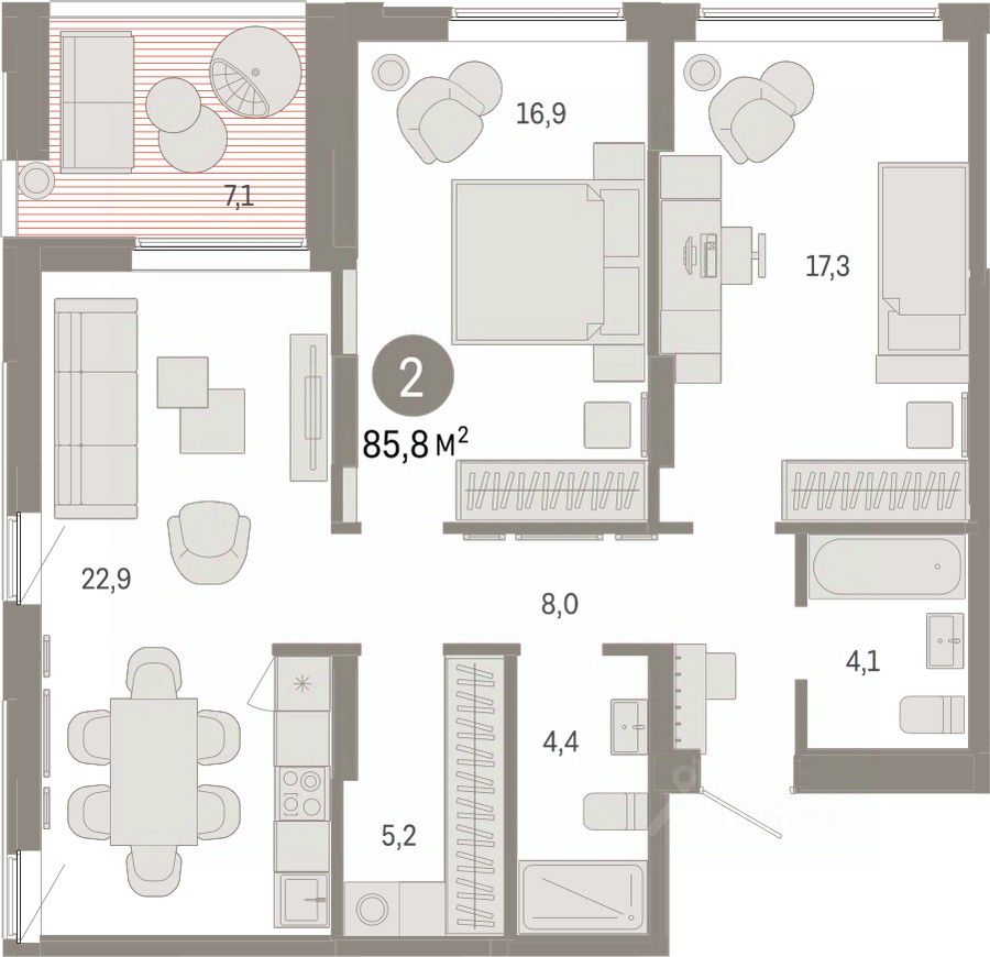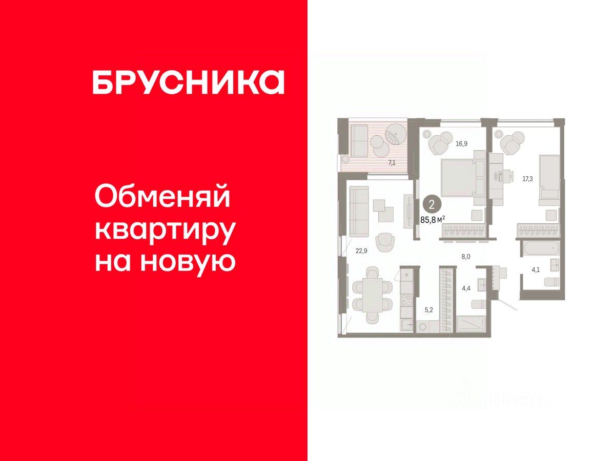 Квартира с кухней-гостиной и двумя спальнями в районе Шишимская горка. Особенности планировки: второй санузел, гардеробная, лоджия, предчистовая отделка, разнесённые спальни. квартиры в нашей базе: ШГР16-Ж5.14.7.