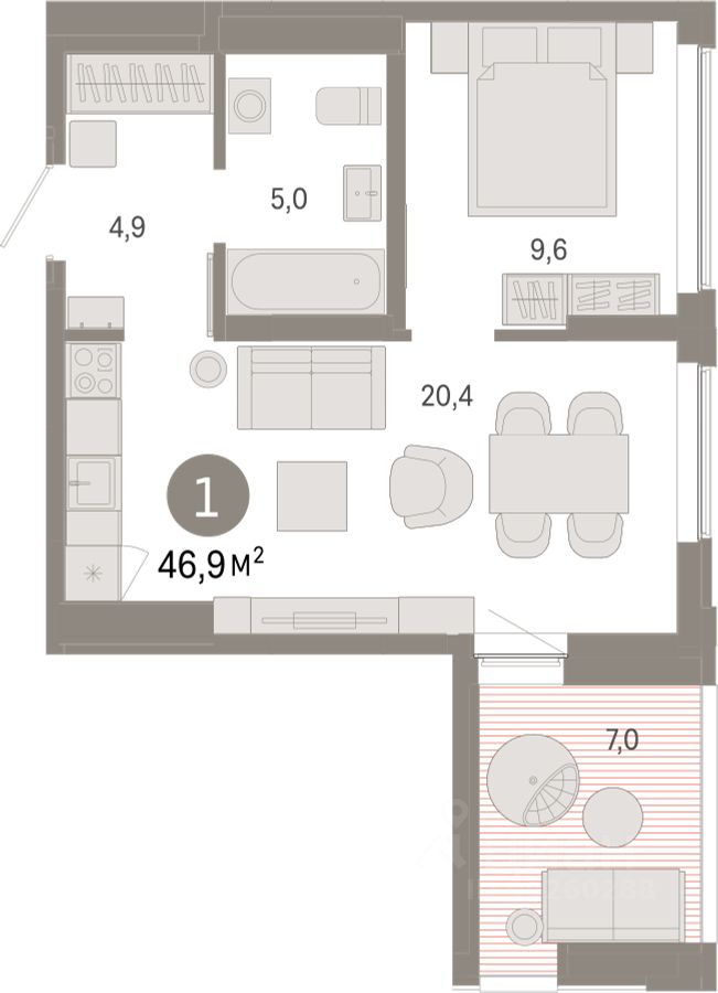 Квартира с кухней-гостиной и одной спальней в районе Шишимская горка. Особенности планировки: предчистовая отделка, разнесённые спальни, терраса на крыше. квартиры в нашей базе: ШГР16-Ж5.14.2.