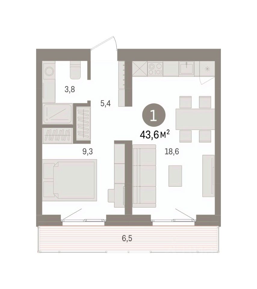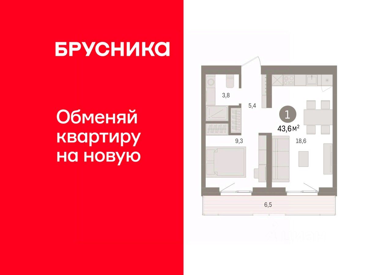 Квартира с кухней-гостиной и одной спальней в Южных кварталах. Особенности планировки: балкон, предчистовая отделка. квартиры в нашей базе: ЮКВ08-Ж6.5.3.