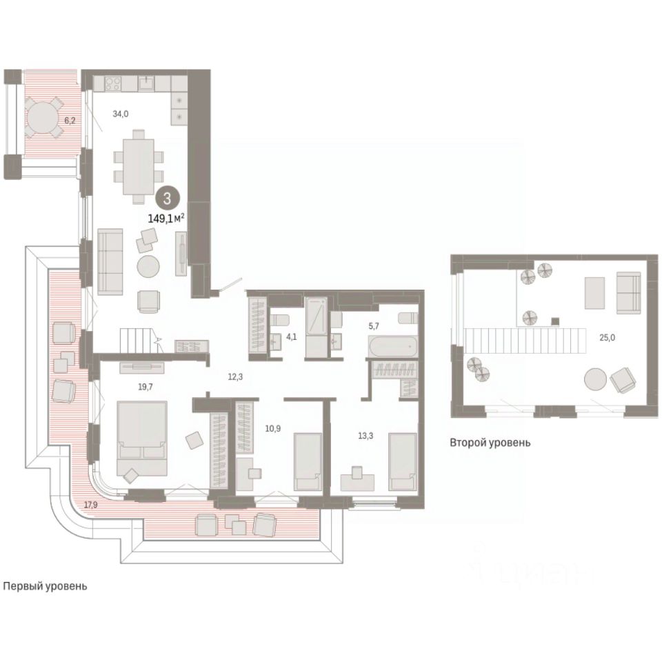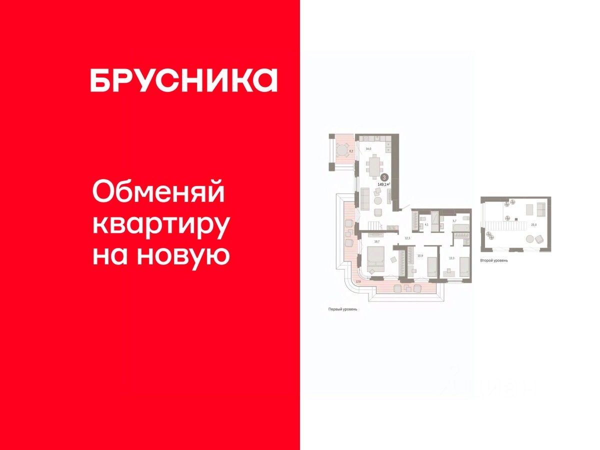 Двухуровневая квартира с кухней-гостиной и тремя спальнями в квартале ''На Некрасова''. Особенности планировки: второй санузел, двухуровневая, предчистовая отделка, разнесённые спальни, терраса на крыше. квартиры в нашей базе: НКР02-Ж2.9.2.