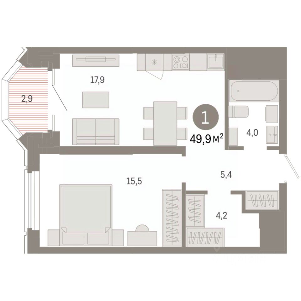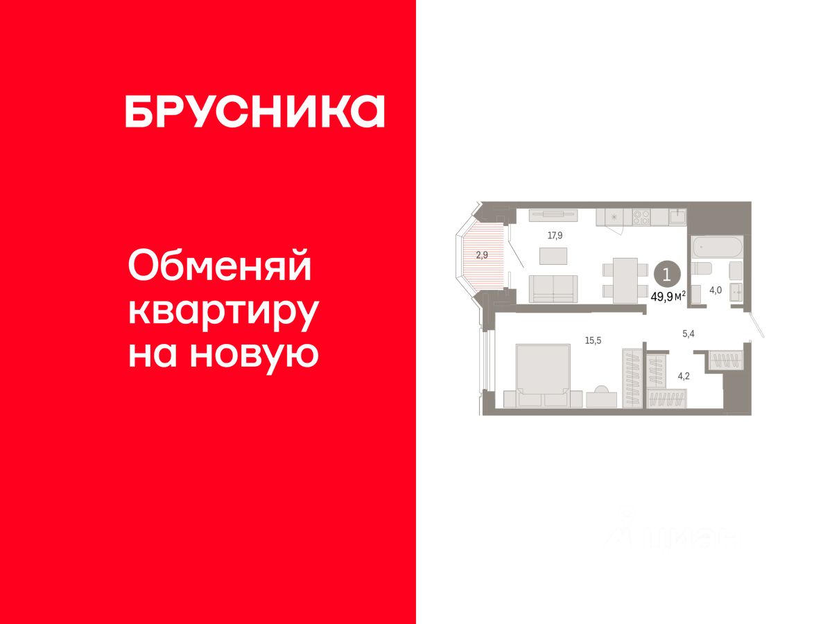 Квартира с кухней-гостиной и одной спальней в квартале ''На Некрасова''. Особенности планировки: гардеробная, лоджия, предчистовая отделка. квартиры в нашей базе: НКР02-Ж1.19.3.