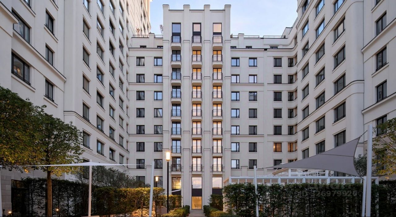 Вход во двор организован через колоннаду. Планировочно он разделён на две части. Парадный партер с большим количеством стриженых растений, фонтанами, цветущими кустарниками и более ''домашняя'', уютная зона, где высажены деревья и низкорослые хвойные растения, многолетники. В центре двора — две детские площадки. #z6EzFz