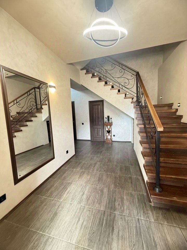 Первый этаже: входная группа, раздевалка, постирочная, гостевой санузел, мастер- спальня 45 метров ( в комнате собственный санузел, кухня, кабинет, гардеробная, спальная зона, собственный выход на улицу). Что позволяет жить двум семьям.