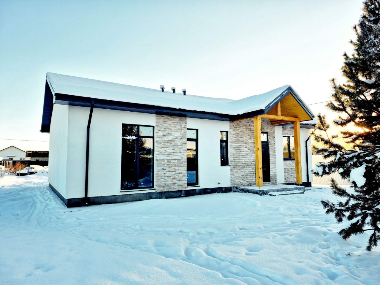 Стильный и современный дом с чистовой отделкой и молодыми деревьями на своём участке.