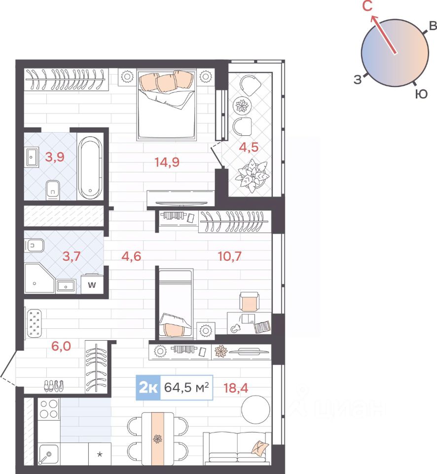 Общая площадь64,5 м2