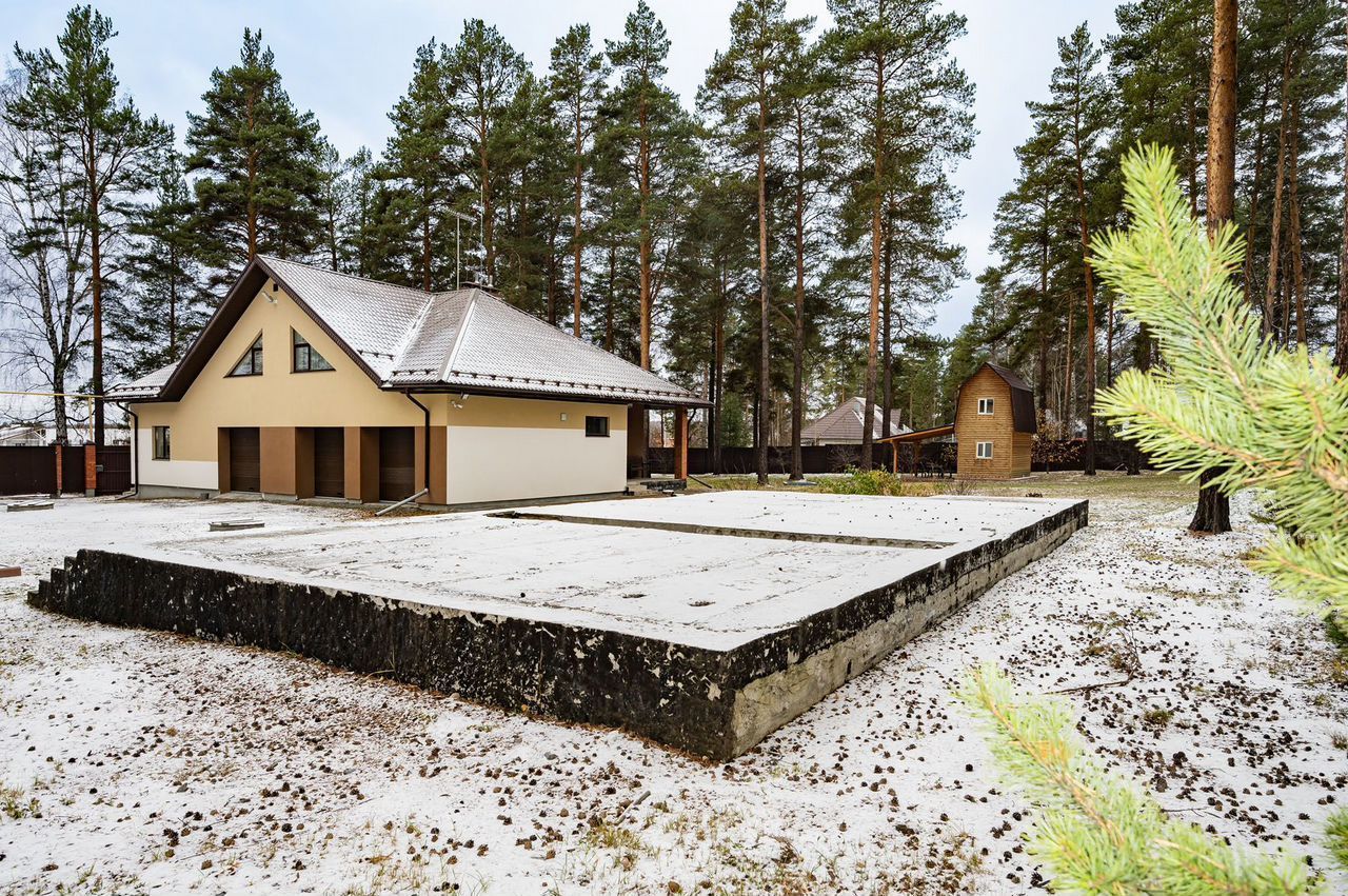 Продаётся дом, просторный хозяйственно гостевой коттедж с тремя гаражными боксами, два летних дома и готовый универсальный фундамент на едином земельном участке площадью 75 соток. Основной Дом: площадь 492,5 м2, года постройки — 2017, готовность — под чистовую отделку, есть дизайн-проект, материал стен — армированный пеноблок, фундамент — железобетон монолит со сваями, кровля — металлочерепица, высота потолков — 3 м, электричество — 380, пластиковые окна, 7 комнат, камин, 2 балкона, веранда, 3 санузла, локальная канализация, скважина, газ. Фотографии интерьера — по запросу. Хозяйственно-Гостевой Коттедж: площадь 341,2 м2, полностью готов к проживанию с котельной, электрощитовой и кладовкой.