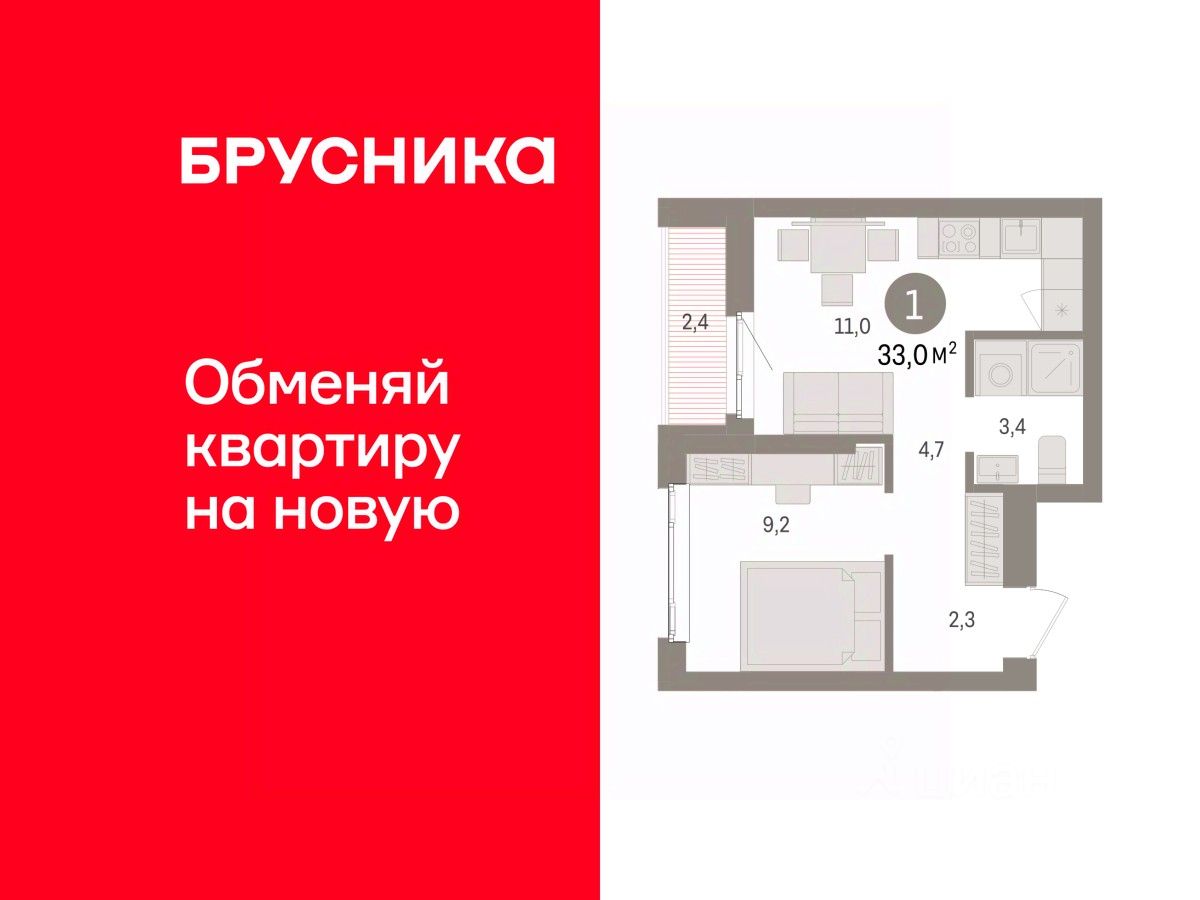 1-комн. квартира от застройщика с предчистовой отделкой в ЖК ''Квартал Траектория'' на 15 этаже. Общая площадь: 33 кв.м. Высота потолков 2.82 м.