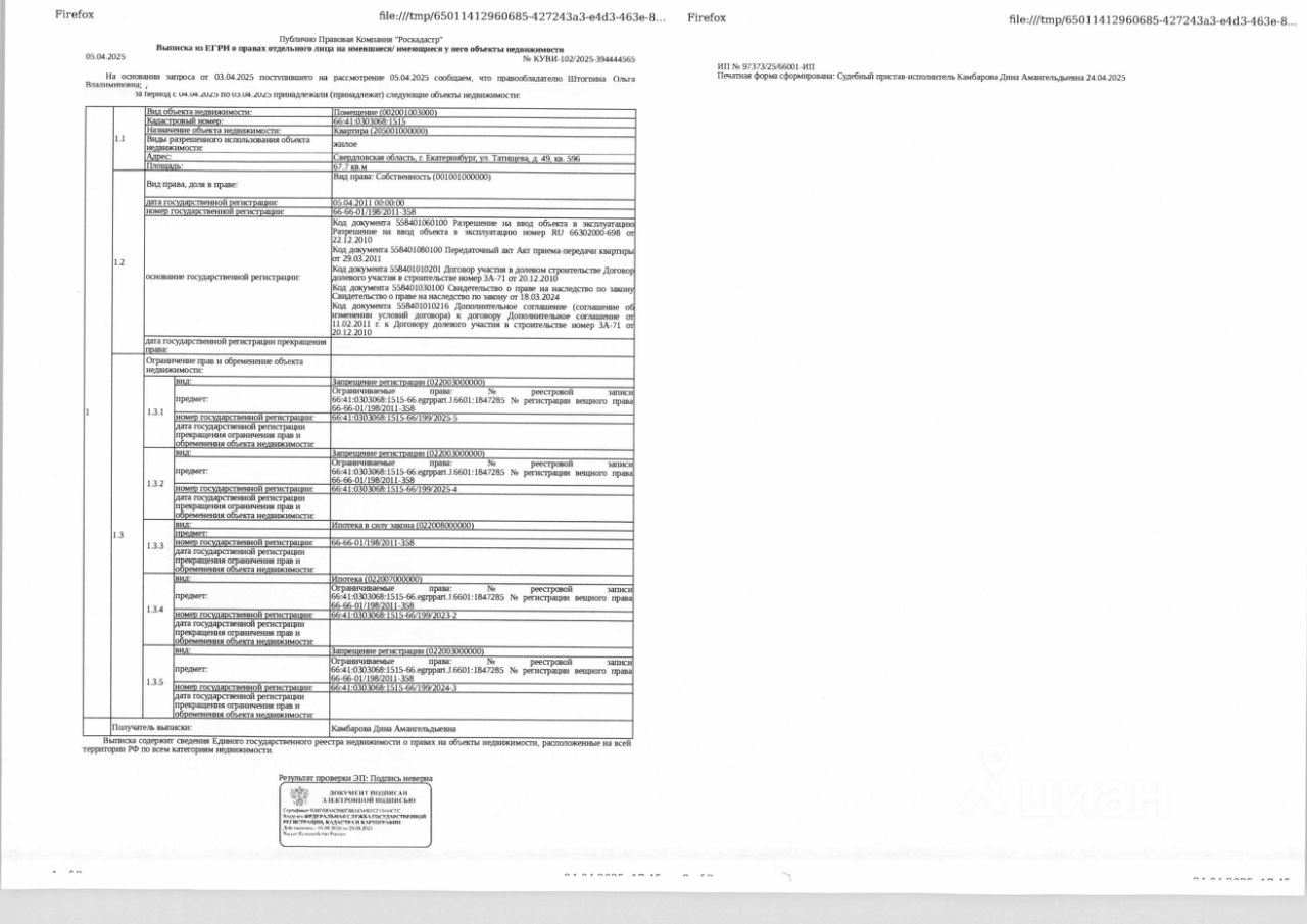 Должник: Штогрина О.В., собственник: Штогрина О.В. Лот: Жилое помещение (квартира), площадь 67,7 кв.м., кадастровый номер: 66:41:0303068:1515, г. Екатеринбург, ул. Татищева, д. 49, кв. 596, (зарегистрированные лица - 1 взрослый), н/ц: 10868341,60 р., з-к: 10868 р. код: 0014, рег. 01-3536/25