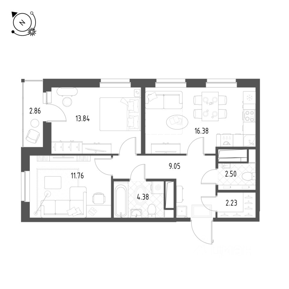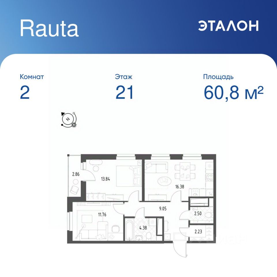 Общая площадь квартиры — 60.8 кв. м, этаж 21 из 25.