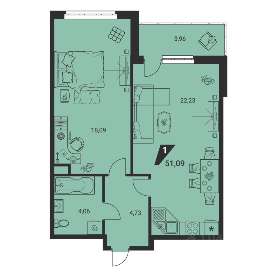 Общая площадь51,09 м2