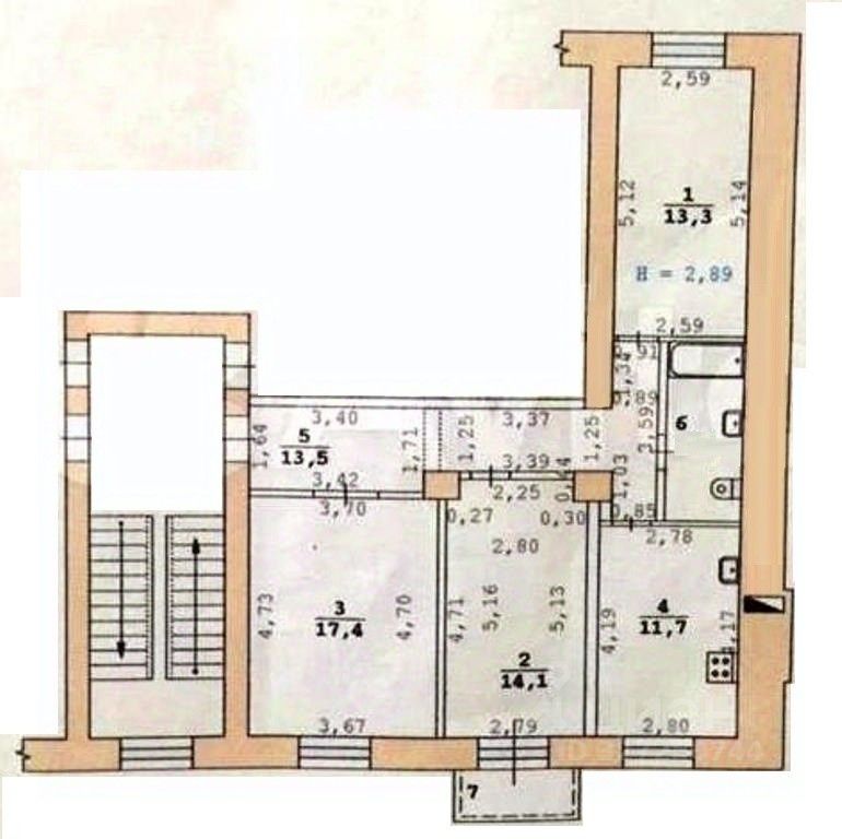 * Три полноценные раздельные комнаты: 17.4 квм, 14.1, квм (с балконом), 13.3 кв.м, просторная кухня - 12 кв.м, санузел совмещен.