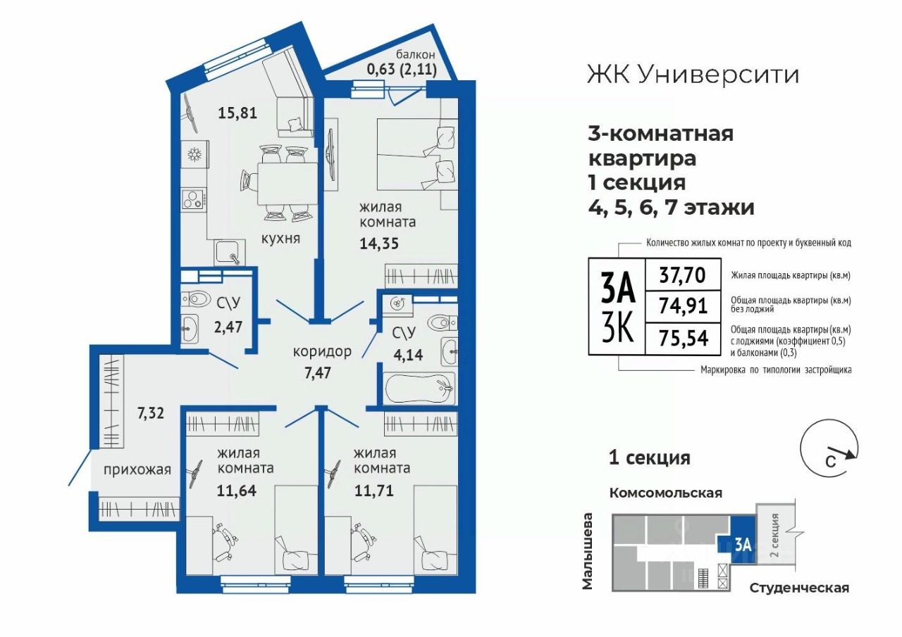 продам 3-к, Малышева, 137а12 414 999 ₽