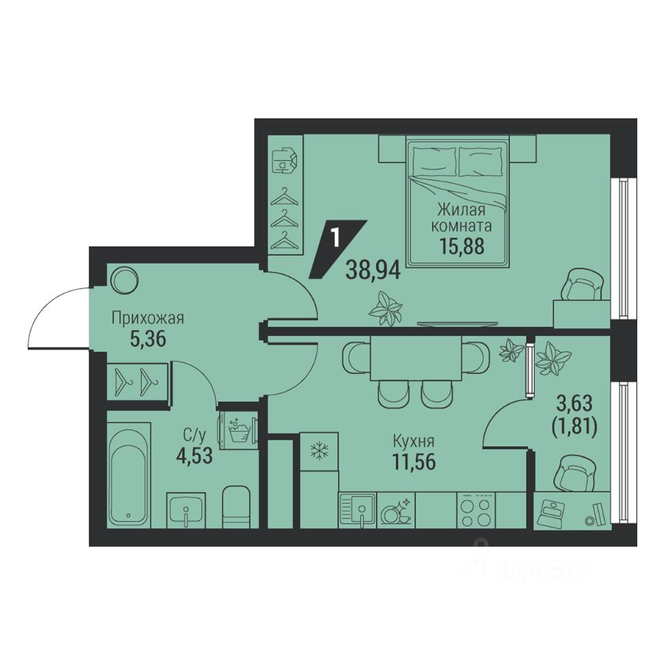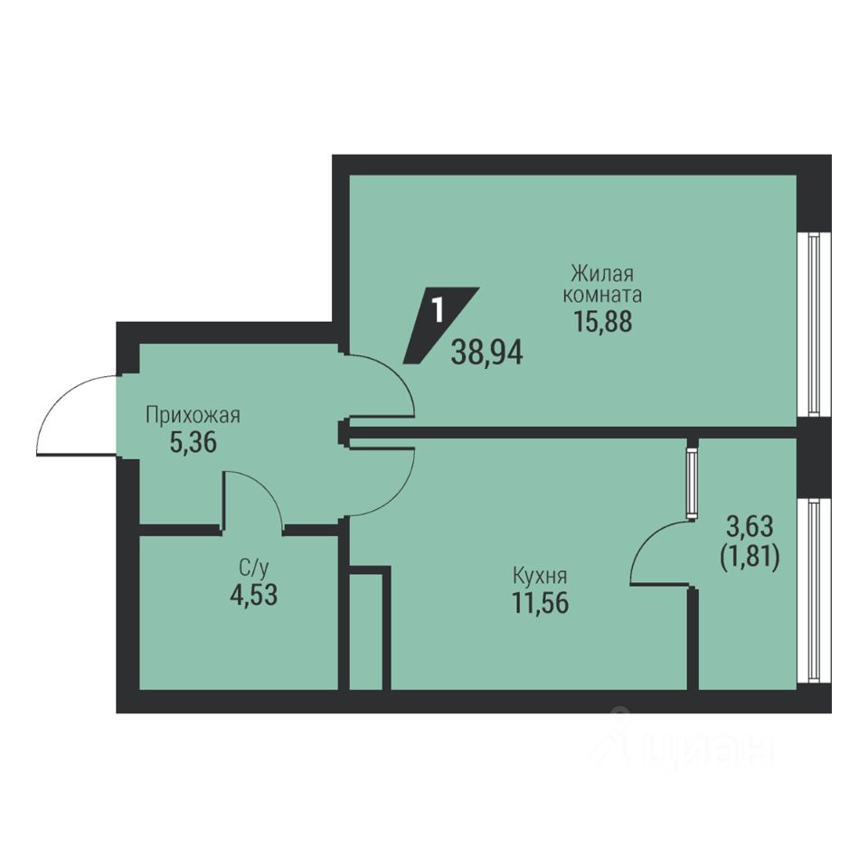 Общая площадь38,94 м2