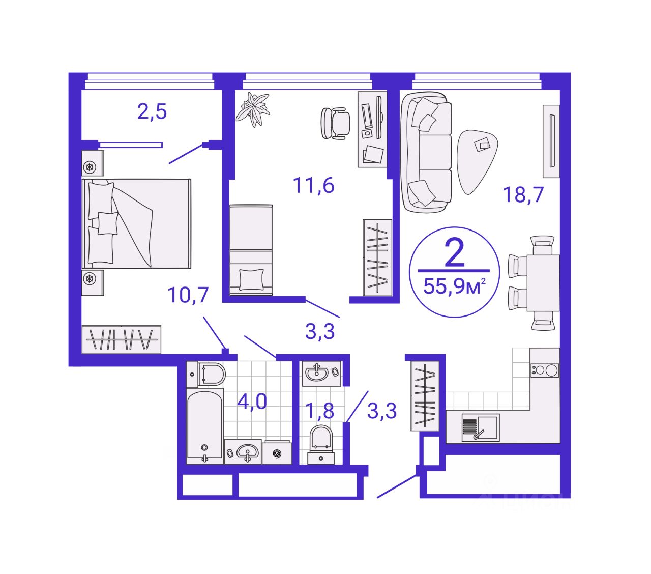Общая площадь54,65 м2