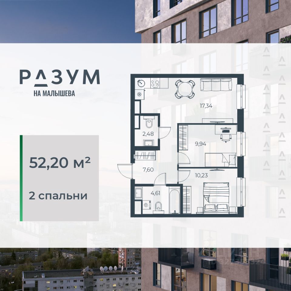 ''РАЗУМ на Малышева'' — это четыре 31-этажных башен на улице Малышева. Дополнительная приватность, безопасность и тишина создаётся за счёт возвышения домов на стилобате. Балконы на фасадах открывают виды на город и во двор, а угловые террасы открывают ещё больше простора и потрясающих видов. Жители квартала ''РАЗУМ на Малышева'' наслаждаются зелёными зонами круглый год. 60% территории занимает озеленение с деревьями, кустарниками и многолетниками. Здесь прогулки, отдых, работа и встречи с друзьями проходят в уютных зонах с перголами, шезлонгами и гамаками. ''РАЗУМ на Малышева'' — это: