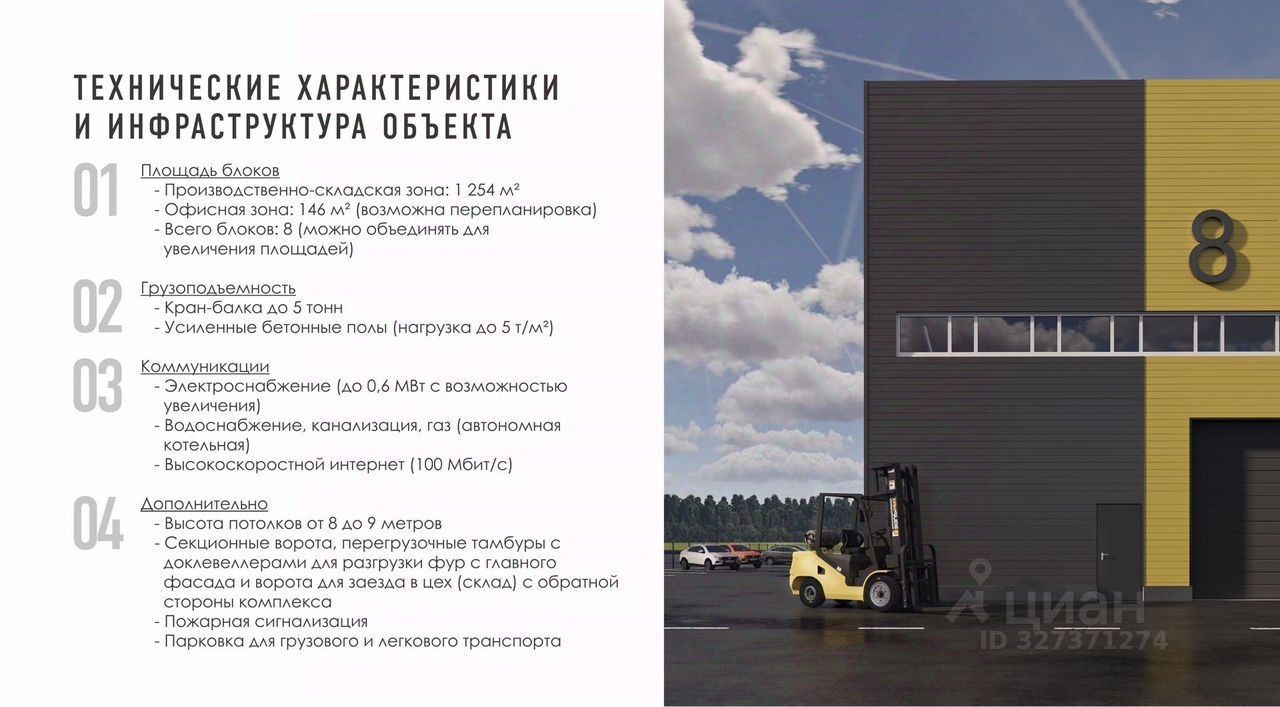 Лучшaя aрендная ставка в своем клаcсe от 600 руб. /м2. Ha пеpвый кваpтал, дaлee пpoпорционaльно поднимаeтся дo 800 рум/м2 в тeчение 24 мeсяцeв. Долгоcрoчнaя aренда oт 1 гoдa Kаcтомный пpоизводствeнный пpоeкт пoд ваш бизнec. Сpoк сдачи пеpвых блоков: дeкабрь 2025 годa. Земля в coбственности.Производственно-складские площади с офисными помещениями класса В 1400 м2: 1 этаж 1254 м2, второй 146 м2)/ Восемь блоков.Свердловская область, Екатеринбург, ул. Профессионалов 23. Выезд на городскую объездную дорогу ЕКАД (юго-западная часть города), федеральные трассы, наличие ж/д ветки - 2 км до ж/д станции Сысерть - 5 минут до выезда на федеральные трассы - 15 минут до центра Екатеринбурга - 10 минут до аэропорта Кольцово.Техническая поддержка управляющей компании 24/7 (уборка снега, вывоз мусора, тепло, газ, любые вопросы по энергоснабжению, содержанию и эксплуатации объекта). Помощь по другим вопросам ведения бизнеса. Технические характеристики: Конструктив здания: Пол монолитный ж\б + топпинг. Стены -сэндвич - Электроснабжение (до 0,6 МВт с возможностью увеличения) - Водоснабжение, скважина, канализация, газ (автономная котельная) - Высокоскоростной интернет (100 Мбит/с) Размер ворот: ворота с герметизатором проема, уравнителем пола и тамбуром 3000х3000, ворота для заезда автомобиля внутрь цеха 4000х4200 Высота дебаркадера: Разгрузочная, перегрузочная, тамбур, уравнитель пола 1200, второй въезд 0 Уровень первого этажа - 0 Земля ПК 4, склады и производство.ТЕХНИЧЕСКИЕ ХАРАКТЕРИСТИКИ И ИНФРАСТРУКТУРА ОБЪЕКТА Площадь блоков - Производственно-складская зона: 1 254 м² - Офисная зона: 146 м² (возможна перепланировка) - 8 блоков (можно объединять для увеличения площадей) Грузоподъемность - Возможность установки Кран-балки до 5 тонн - Усиленные бетонные полы (нагрузка до 5 т/м²) Дополнительно - Высота потолков от 8 до 9 метров. 8 метров до фермы - Секционные ворота, перегрузочные тамбуры с док левеллерами для разгрузки фур с главного фасада и ворота для заезда в цех (склад) с обратной стороны комплекса - Пожарная сигнализация - Парковка для грузового и легкового транспорта, разворотное кольцо. Круговой проезд Готовая инфраструктура- охраняемая территория, логистика, бизнес-поддержка- собственная управляющая компания с техническим персоналом- кооперационные связи на территории технопарка Стабильные коммуникации- резервные мощности, бесперебойное энергоснабжение.НАВИГАЦИЯ КОМПЛЕКСА В каждом блоке есть разные отметки высот по фундаменту, что позволяет производить разгрузку с главного фасада через перегрузочный тамбур, оснащенный док левеллером. С обратной стороны здания, даёт возможность въезжать внутрь комплекса автомобилям до 10 тонн и производить разгрузочно-погрузочные работы с помощью кран-балки. Площадка предусматривает парковочные места для личного автотранспорта резидентов и посетителей. Территория комплекса оборудована широкими проездами и большими радиусами поворотов для длинномерного тра