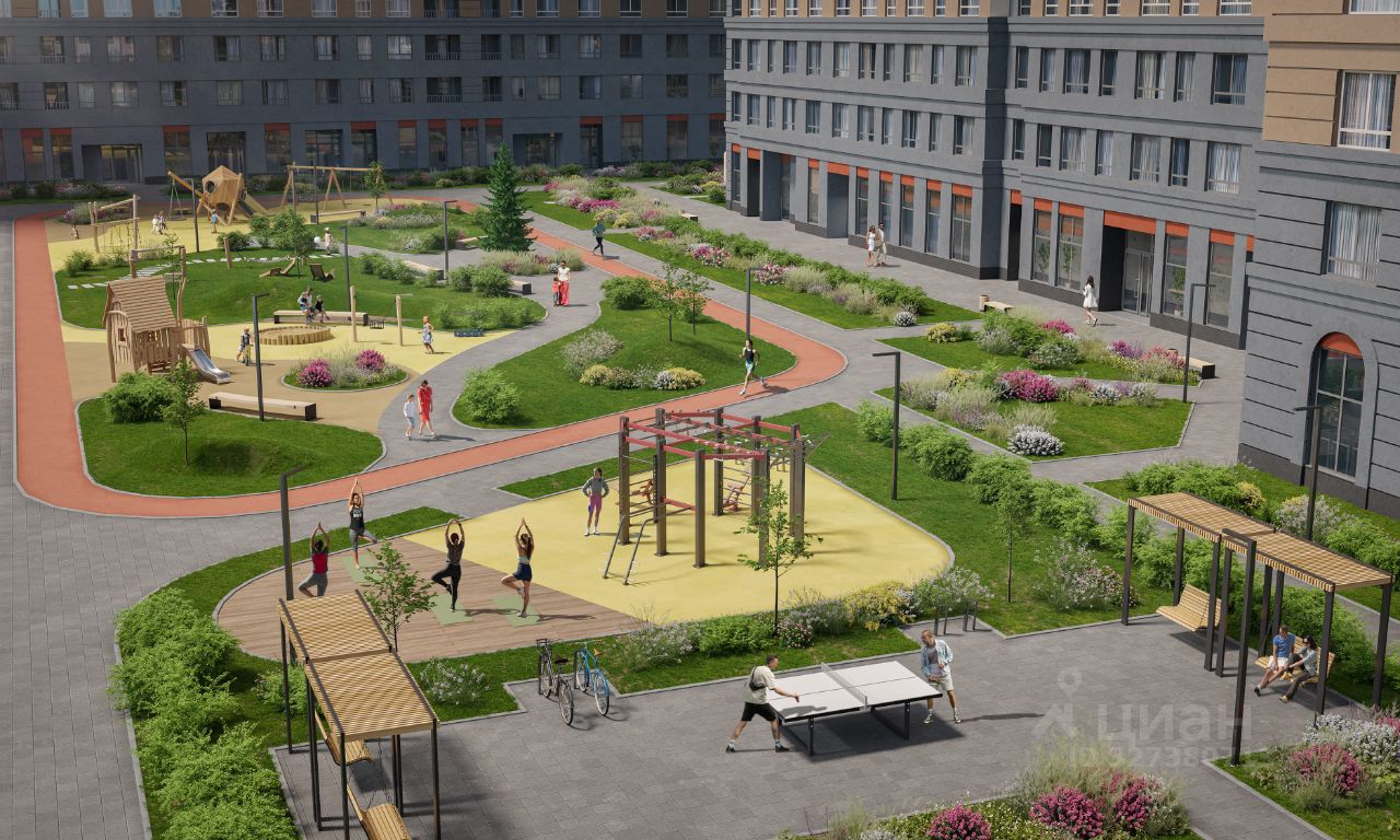 На территории квартала планируется: видеонаблюдение 24/7, подземный паркинг с доступом на лифте, кладовые, велодорожки, многоуровневое озеленение, workout зоны для уличного фитнеса, детские игровые комплексы в эко-стиле. На первых этажах будут располагаться торговые галереи.