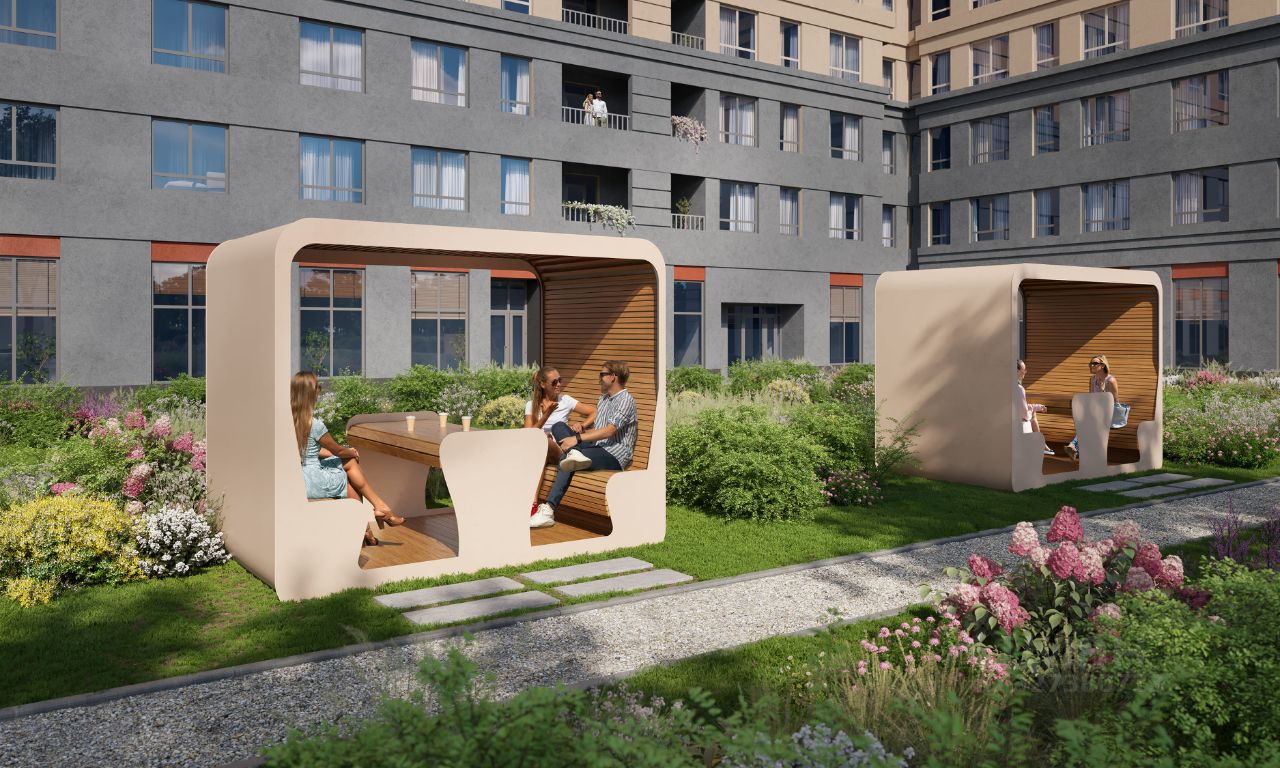 На территории квартала планируется: видеонаблюдение 24/7, подземный паркинг с доступом на лифте, кладовые, велодорожки, многоуровневое озеленение, workout зоны для уличного фитнеса, детские игровые комплексы в эко-стиле.