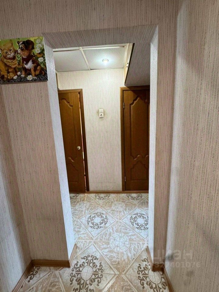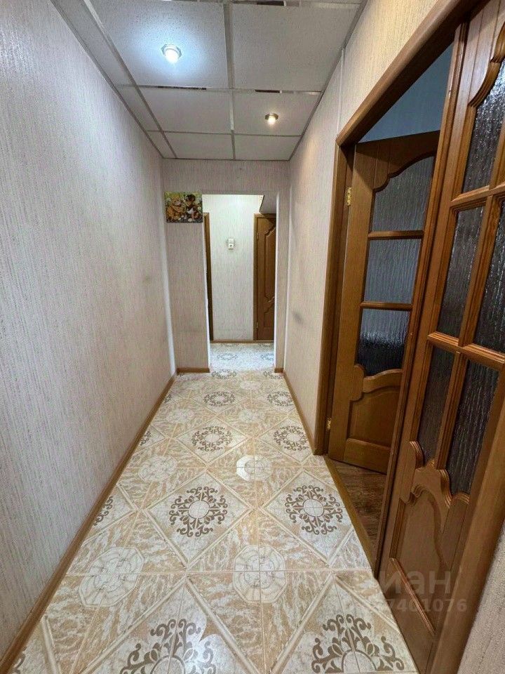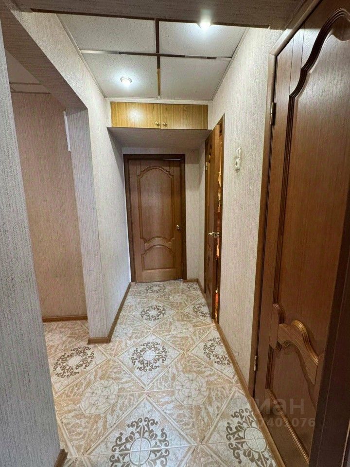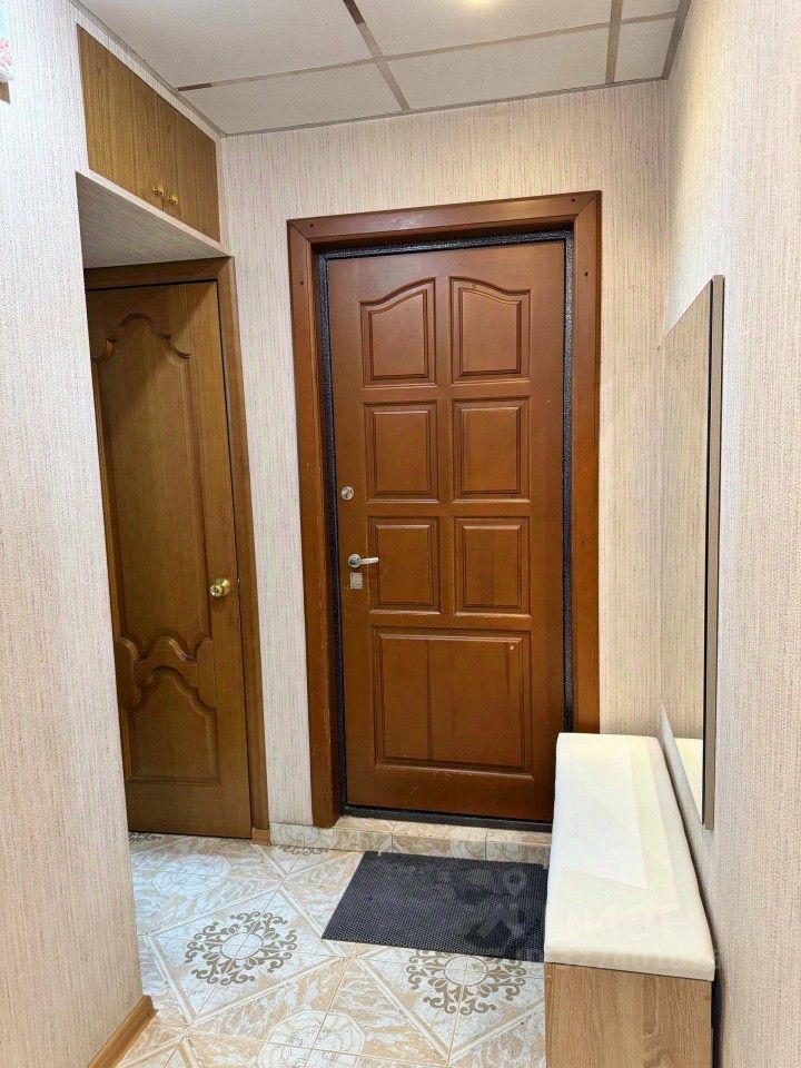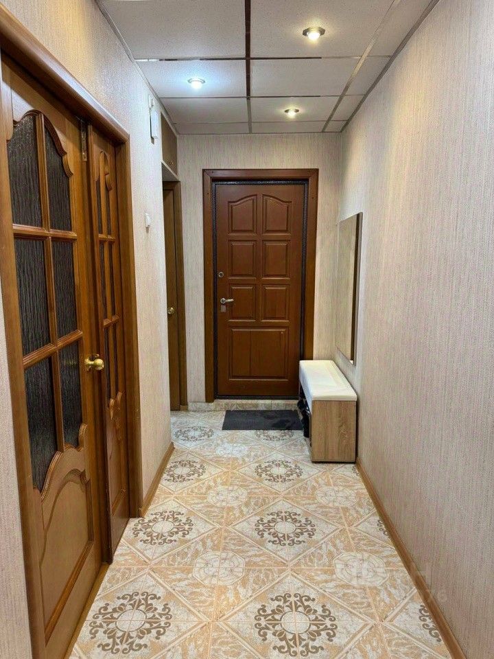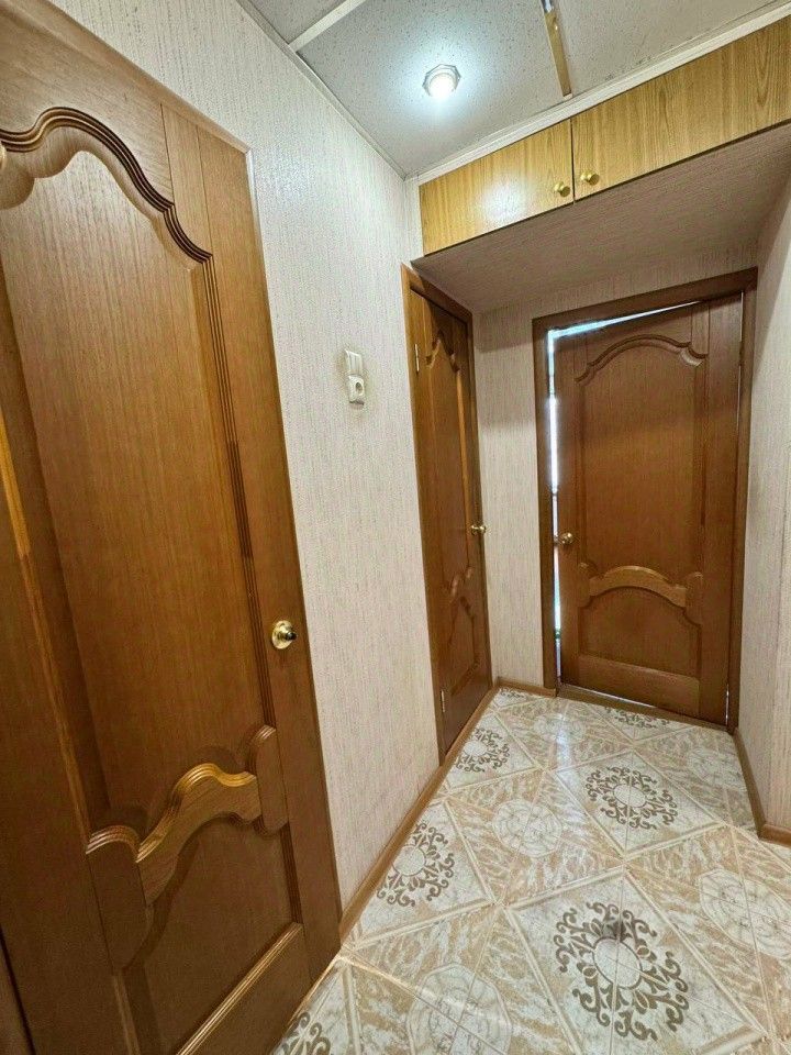 В коридоре на полу плитка керамическая, красивые деревянные межкомнатные двери, натяжные потолки. Есть кладовка, которую можно использовать как гардеробную. Остается большой шкаф-купе в комнате.