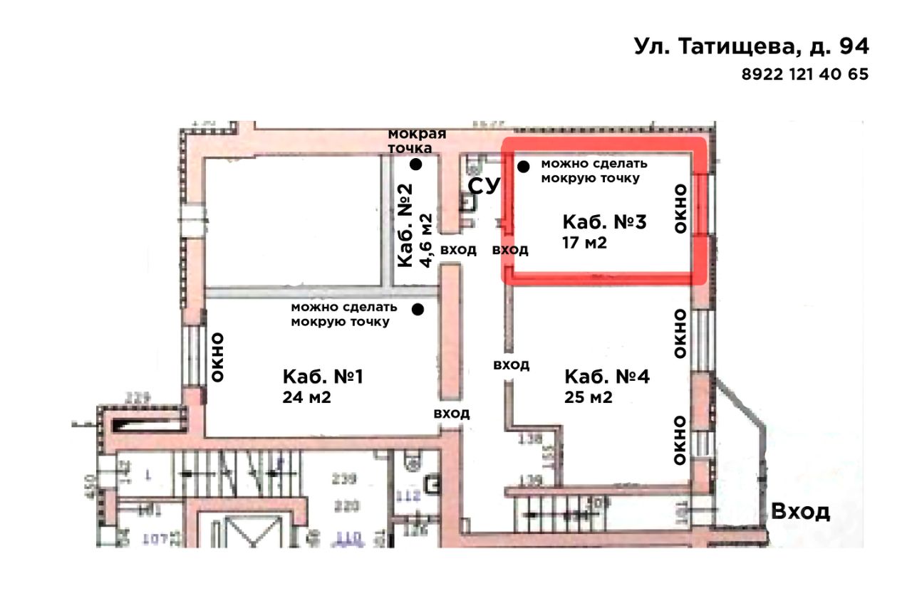 В помещении так же доступны офисы: 4,6 м2 и 24 м2 с мокрыми точками, 25 м2.