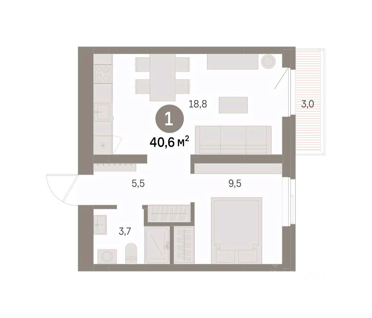 Квартира с кухней-гостиной и одной спальней в районе Шишимская горка. Особенности планировки: предчистовая отделка, стартовая цена. квартиры в нашей базе: ШГР06-Ж1.3.5.
