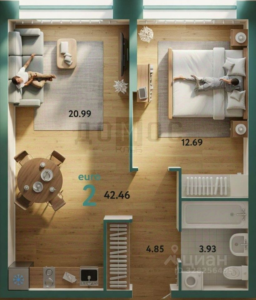 Планировка правильной формы с общей площадью 43 квм, просторная кухня-гостиная с зоной отдыха 21квм, спальня с нишей под шкаф-купе 13квм, коридор 5 квм и санузел.